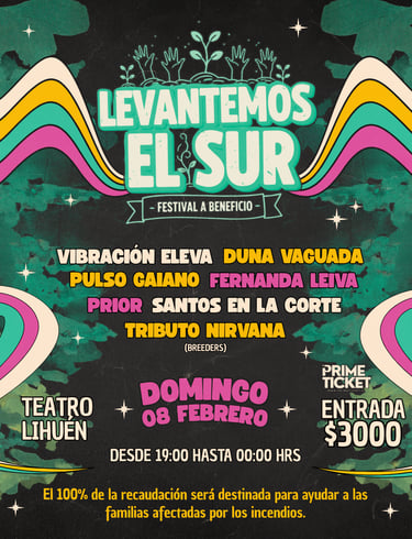 Este domingo 08 de febrero, el Teatro Lihuén será el punto de encuentro para la música y la solidaridad con la realización del Festival Levantemos el Sur, un evento a beneficio de familias afectadas por los incendios forestales en la región del Biobío.